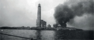 Vihollinen yritti vallata 26.7.1941 Bengtskärin majakkasaaren Suomenlahden suulla. Saari kuvattuna koillisesta taistelun aikana. Vänrikki Paul Åsvik (15.mek) kaatui kuvan keskellä olevalle rantakalliolle johtaessaan tykkiveneiltä koottua maihinnousuosastoa.